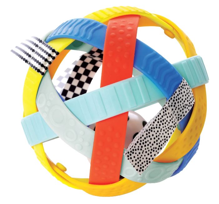 A sensory experience rolled into a ball of flexible, squeezable, rattle-filled fun! The Blissful Ball is made of soft bendable plastic bands drenched in color and covered in texture. It's easy to grasp, squish and teethe for little hands and engaging minds. Four textured black and white ribbons are attached to various bands for added tactile enjoyment and visual interest. The black and white spotted ball in the center moves freely inside the ball, making a soft rattling sound with every roll, shake and bounce. The Blissful Ball is a perfect toy for sensory play, fostering visual tracking, motor development and teaching cause and effect.