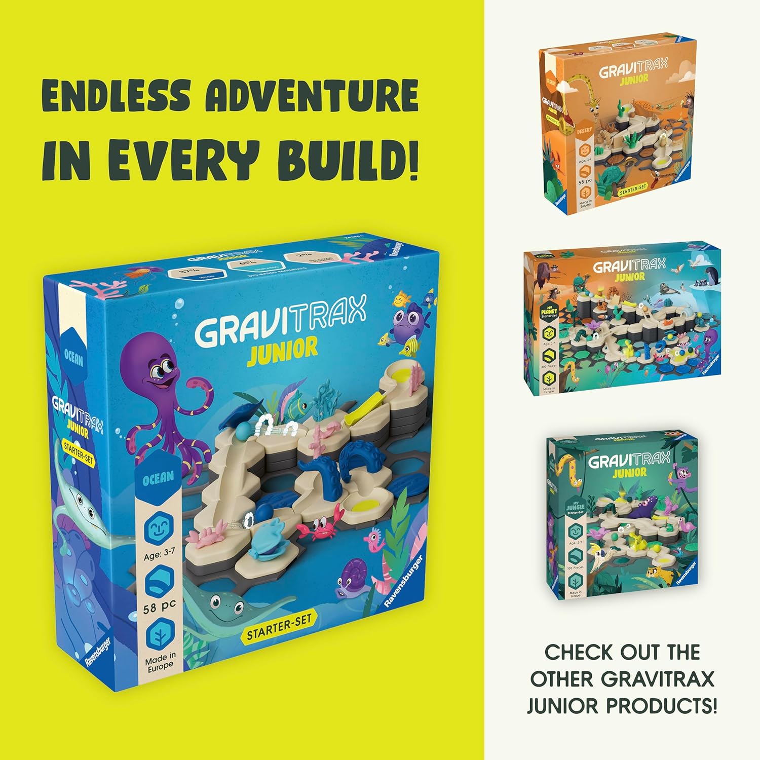 With GraviTrax Junior, building and playing fun is always on track! This creative, expandable system is especially designed for younger children, challenging them to use their imagination to build their own marble runs! STEM-friendly concepts build critical thinking and problem-solving skills. Completely open-ended, this Jungle Starter-Set contains everything needed to build a variety of tracks. Expansion sets are easily added for even bigger fun! With many parts made of wood bioplastic, you can feel good about giving your favorite child a sustainable toy that will provide years of fun, educational play! Ages 3–7.