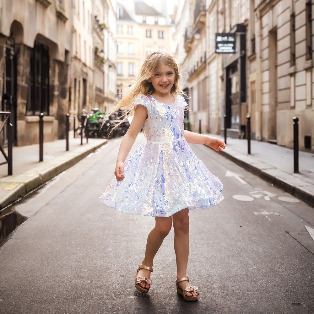 Encourage your young superstar's dreams of singing to sold out stadiums with the gift of this super sparkly dress. Covered in a mix of large and small iridescent sequins, the dress glows white at first glance, but reflects soft purples and rainbow hues as it moves - perfect for rising stars who love to shine. Short flutter sleeves add a playful touch while keeping it comfy for dancing, singing, and striking a pose just like Taylor Swift! This dazzling dress is sure to be your concert queen's new favorite outfit for pretend play, holiday parties, and even everyday trips to the toy store. Added perk: it's machine washable!
