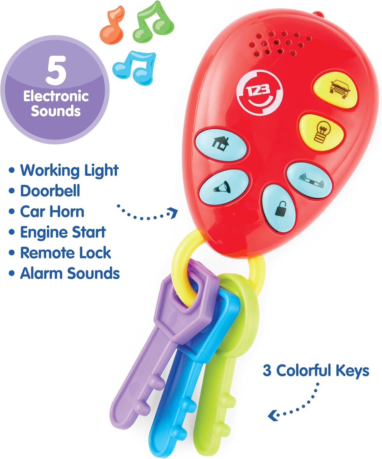 - Spark imaginative play with a battery-powered key ring and cell phone set! Both are easy for little hands to grasp and explore, promoting safe development. • Key ring features 5 exciting sounds: doorbell, car horn, engine start, remote lock, and alarm, all in a kid-friendly volume.
