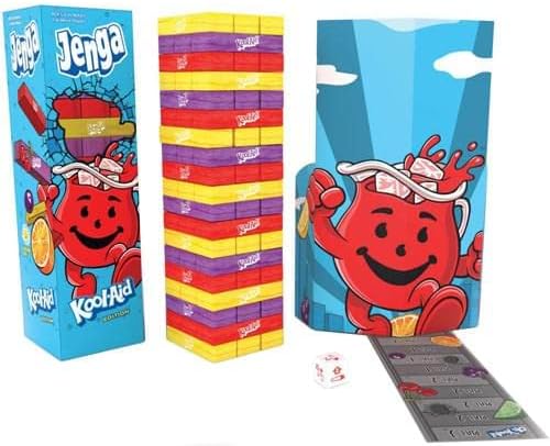 Thirsty for a new way to enjoy your favorite childhood drink mix? JENGA: Kool-Aid serves up fun and nostalgia in this intense version of the classic block stacking game! Remove and replace Cherry, Lemon, and Grape colored blocks based on the roll of a die to build up extreme heights of flavor—but make way for Kool-Aid Man! The iconic smiling pitcher inches closer to breaking through your rewarding tower with every move. OH YEAH!
