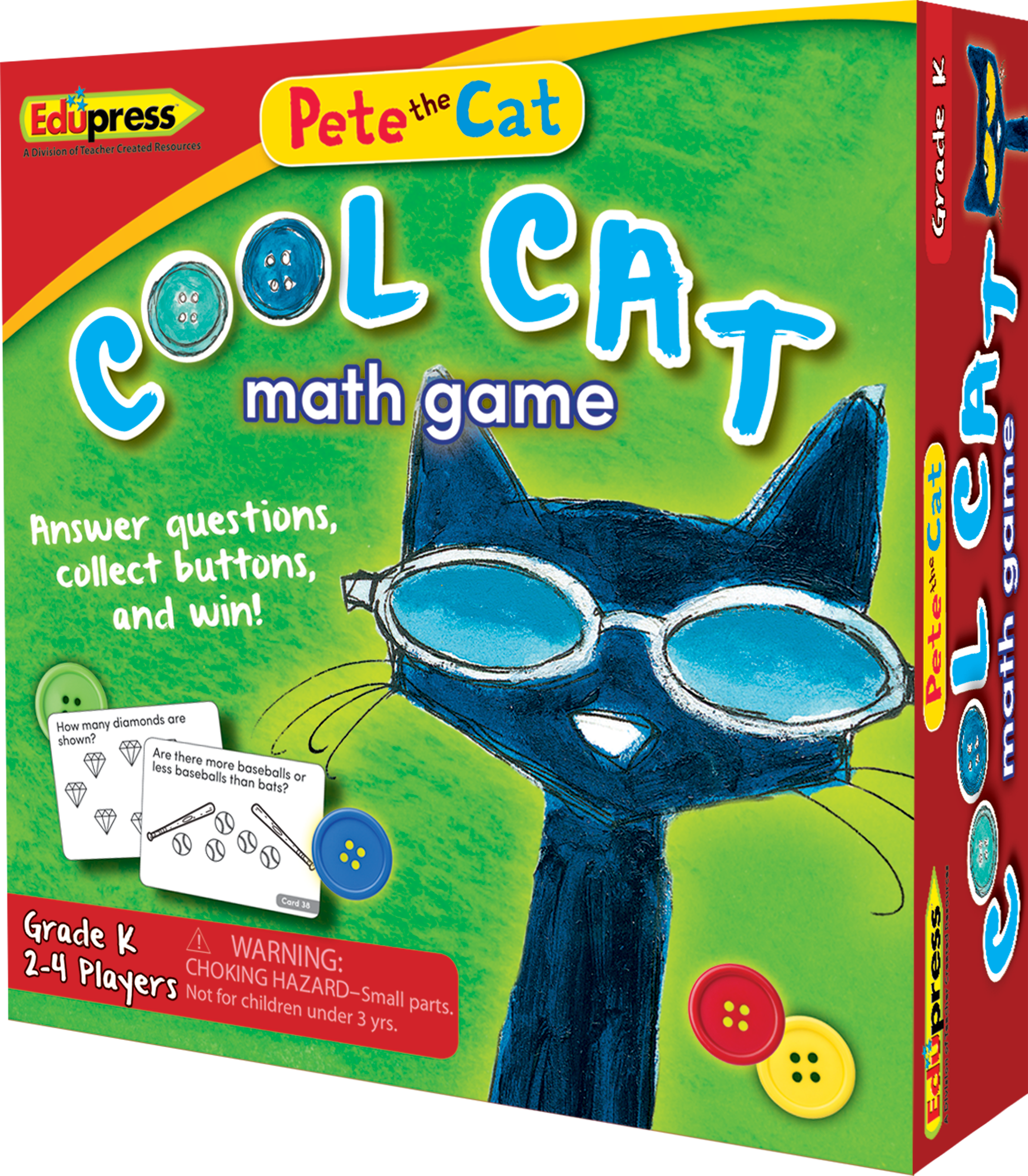 Turn students into cool math cats with this groovy game! Players practice grade-level math by drawing cards and answering questions. A correct answer earns the player a Pete button. The first player to earn four buttons wins the game. When players draw Cool Cat Cards, they earn additional buttons—or give them up. Includes 120 cards, covering all grade-level Common Core State Standards. Standards indicated on each card. Directions with additional activities included. Ages 5+