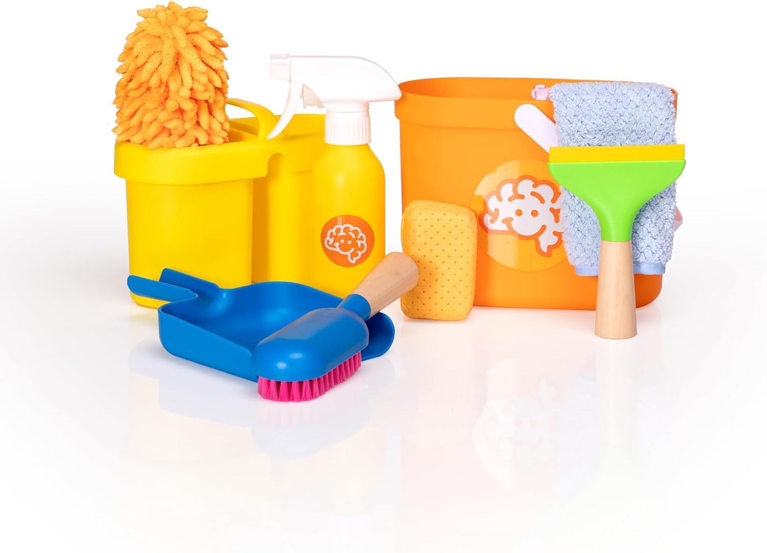 - Includes bucket, storage caddy, spray bottle, duster, squeegee, dustpan with brush, cleaning cloth, sponge.