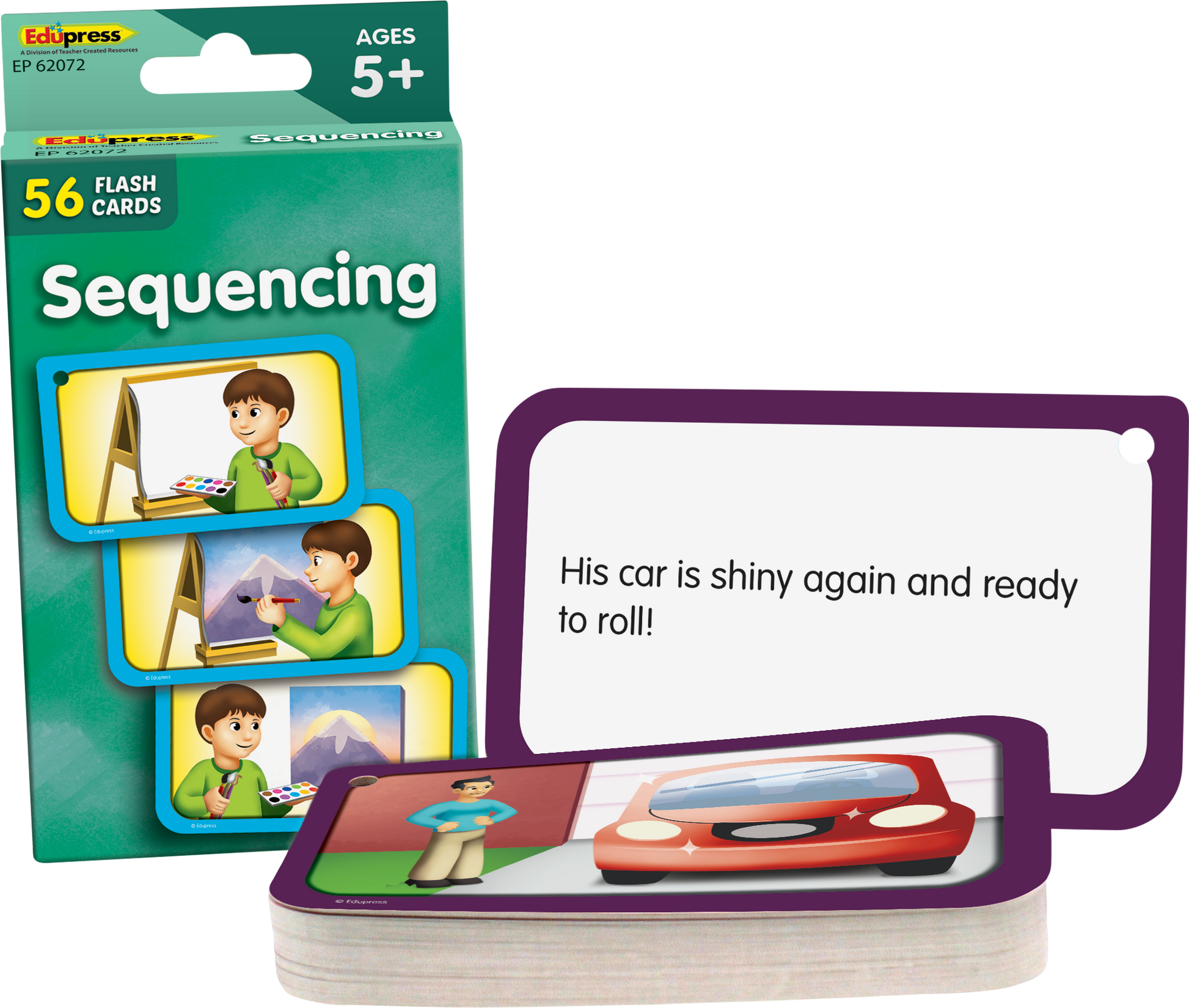 Each flash card set contains a collection of full-color, high-interest student cards, as well as instructions and tips for the teacher or parent, along with suggested activities. Each card has a hole in the top corner that can be fit with a ring or stringa ring or string to help with organization and storage. Additionally, each card has one corner that is shaped differently than the others. By lining up the non-rounded corners, the flash cards can quickly be faced in the same direction. When applicable, flash card sets include answers in small print on the reverse side of each card.